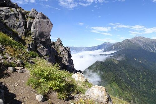 9/21 上高地にある焼岳に登りました。(つづき) 焼岳トップ(北峰)の直前から穂高の峰々が眼下に丸見え・・・ ・・・すごい眺望なので前に進めないほど (^^)/ 雲海の奥に笠ヶ岳、雲もどんどん動いていました。 ヘルメットの山ガール、左手にはフィギア? ↑…